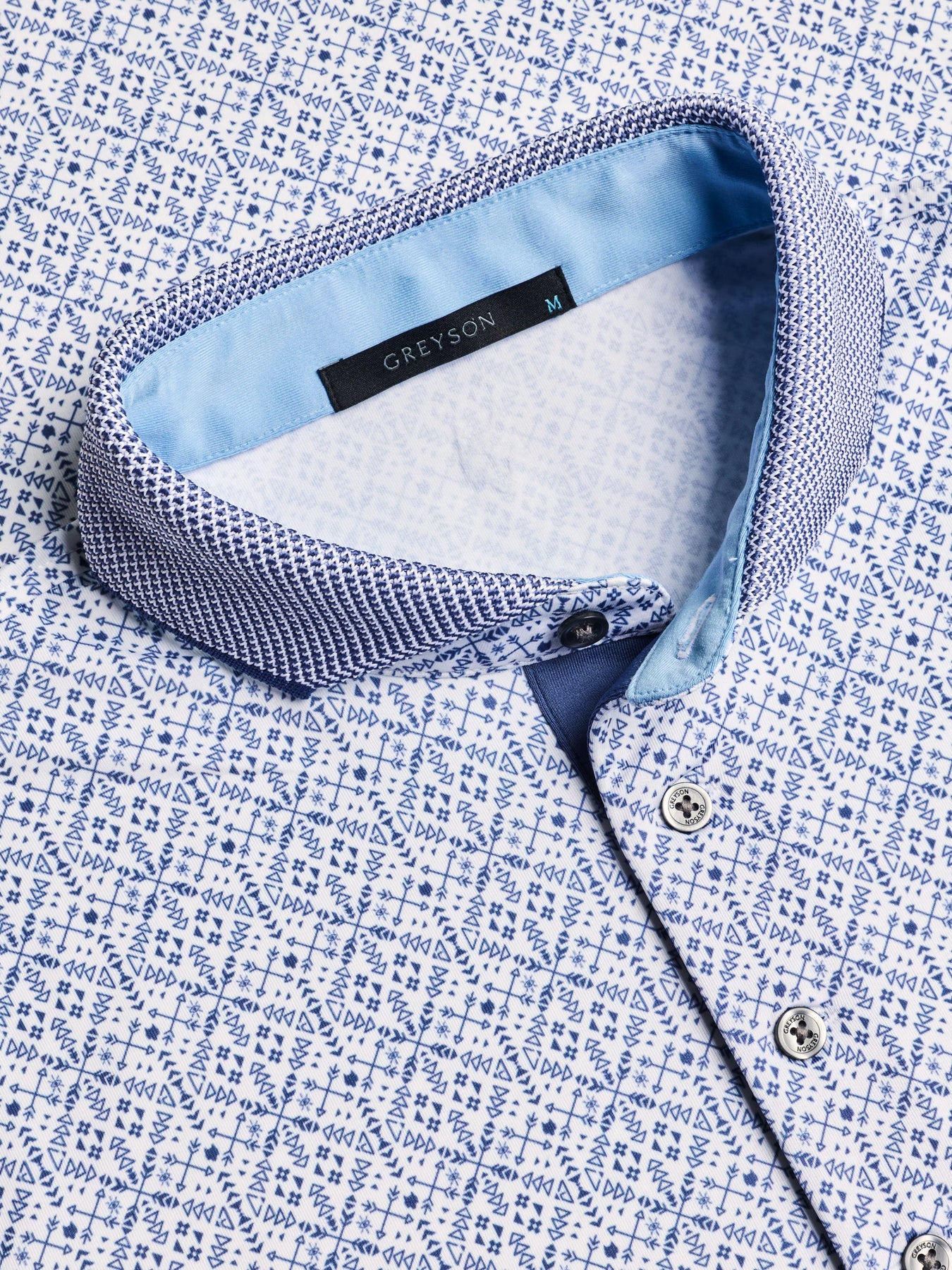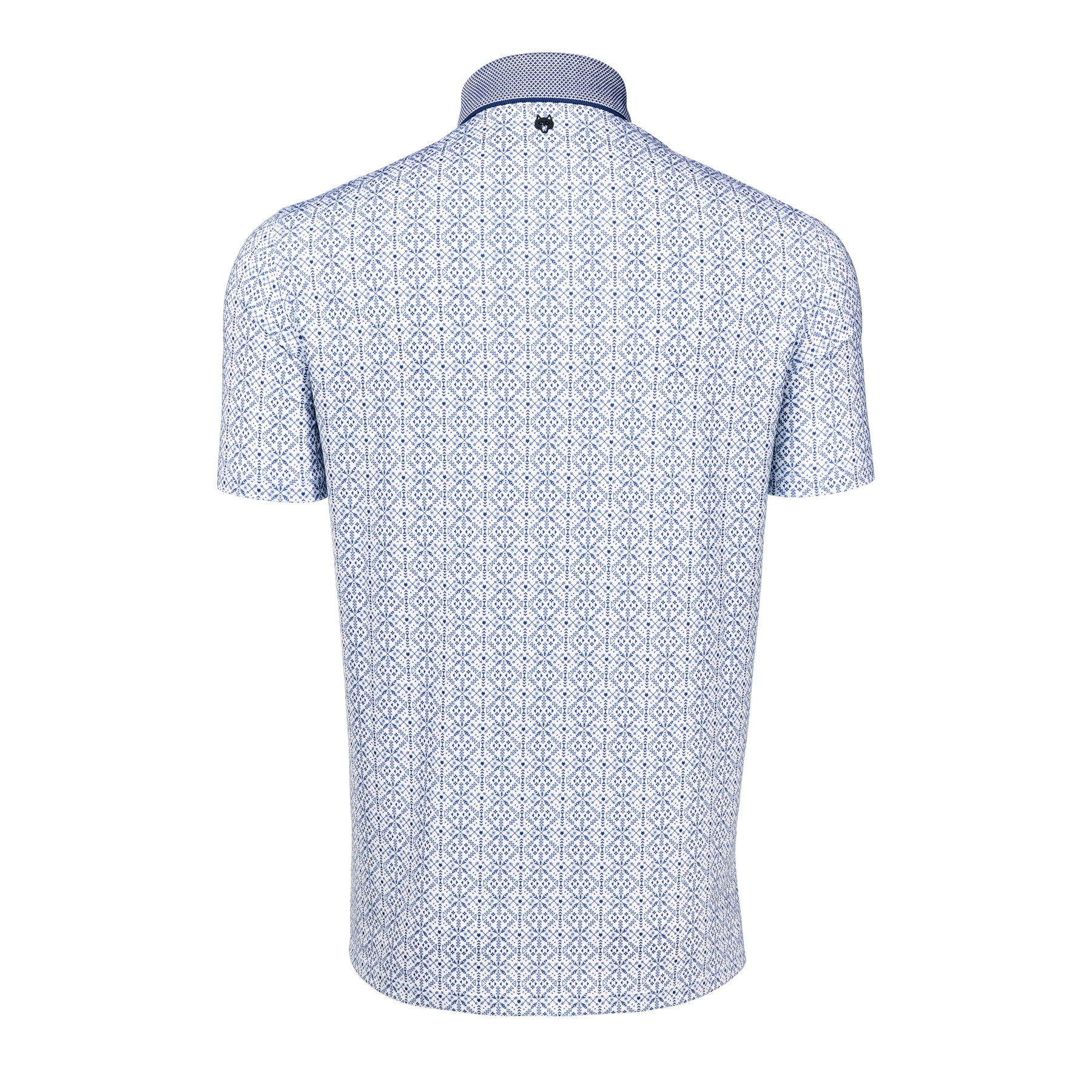 The Echo Falls Short Sleeve Polo brings a refined approach to a versatile performance style, featuring a tonal geometric print that adds visual texture and depth while maintaining a classic feel. The pattern is an evolution of an early Greyson design, drawing from foundational motifs in the brand’s history and subtly incorporating the iconic Greyson wolf throughout for a distinctive, considered finish. Crafted from a lightweight technical fabric, it delivers breathable comfort with moisture wicking and quick drying performance that feels effortless throughout the day. A knit jacquard cutaway collar and streamlined placket create a clean, elevated look, while subtle contrast details bring balance to the patterned body. Designed with built in stretch and UV protection, it moves easily from the course to everyday life and is well suited for golf, work appropriate casual settings, travel, and daily wear.