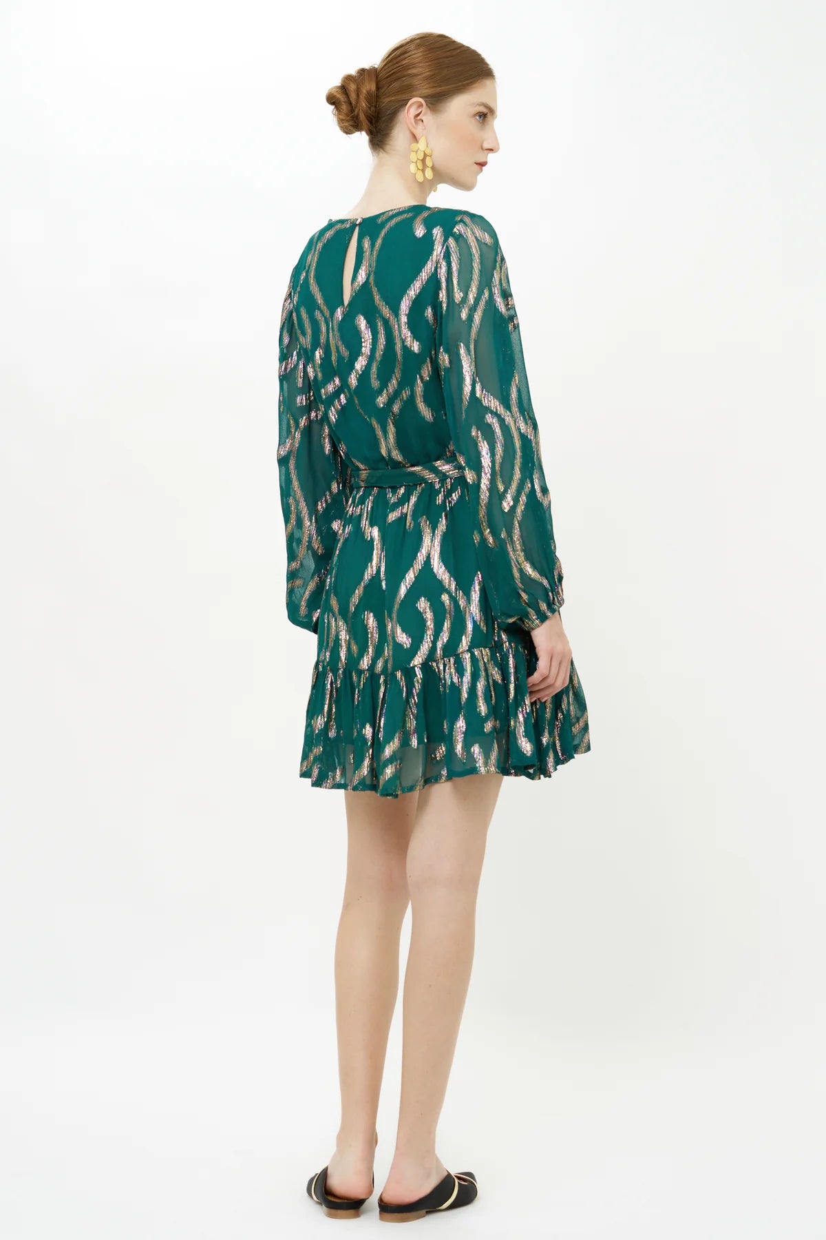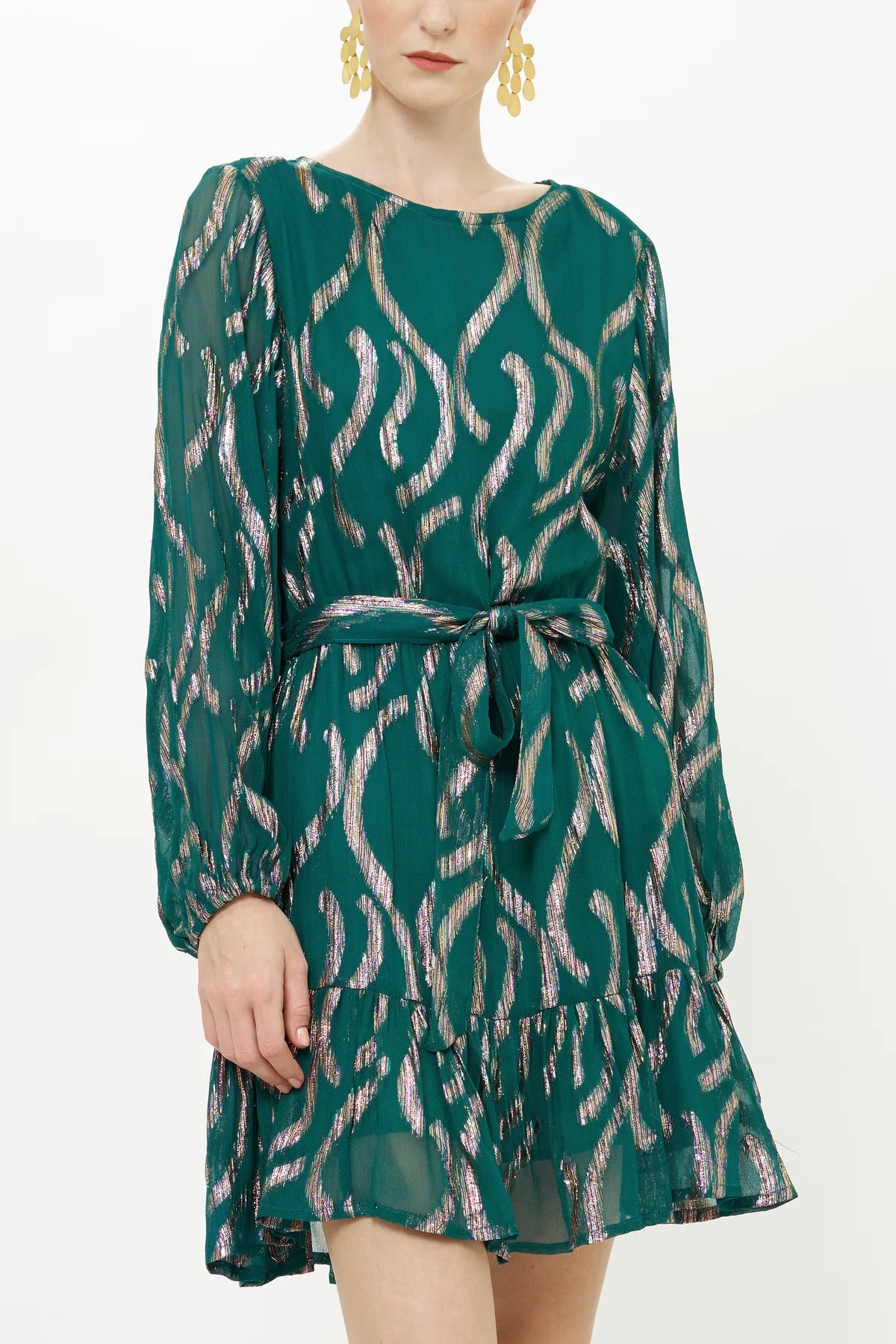 This dress lives up to its flirty name. Flowing Georgette fabric embellished with multicolored metallic Lurex threads woven in.